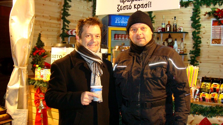 В новогодние праздники в нашем городе мэрия организовала так называемую "Рождественскую деревню". Это аттракционы, карусели, ларьки и т.д. Так вот однажды вечером, прогуливаясь там я остановился у одного из ларьков выпить горячий кофе. Разговорились с хозяином, который узнав, что я из бывшего СССР, преобразился, и подсев поближе гордо заявил на чистом греческом языке, что его фамилия - Леонов (на фото справа). Еще он сказал, что его отец из Сибири, а мать гречанка, и что он родился и вырос в Греции, еще рассказал, что в городе в свое время имел кофейню - Калашников в честь нашего знаменитого конструктора,ну и самое главное, что он племянник дважды героя СССР летчика – космонавта Алексея Архиповича Леонова!