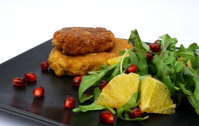 На фото котлеты из тыквы с салатом из Рукколы с апельсином