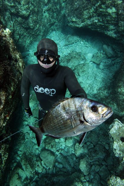Еще один престижный представитель семейства спаровых. Встречается на глубинах от 30-250м. весом до 9 кг. Ловят ее так же, как Синагриду и любимая наживка у нее маленькие кальмары и осминожки. На островах со скал можно попробовать поймать его на удочку на большой глубине используя в качестве наживки сардину, кальмара или каракатицу. Лучший период, май.